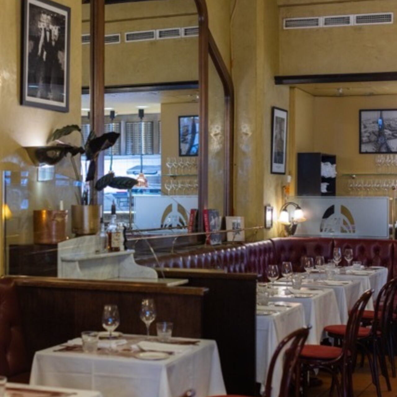 På gateplan er det tett mellom bordene og høy stemning. Rommet ble i sin tid laget etter inspirasjon fra Brasserie Pyrénéen i Toulouse.