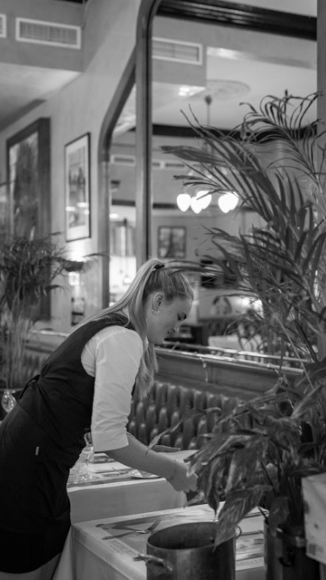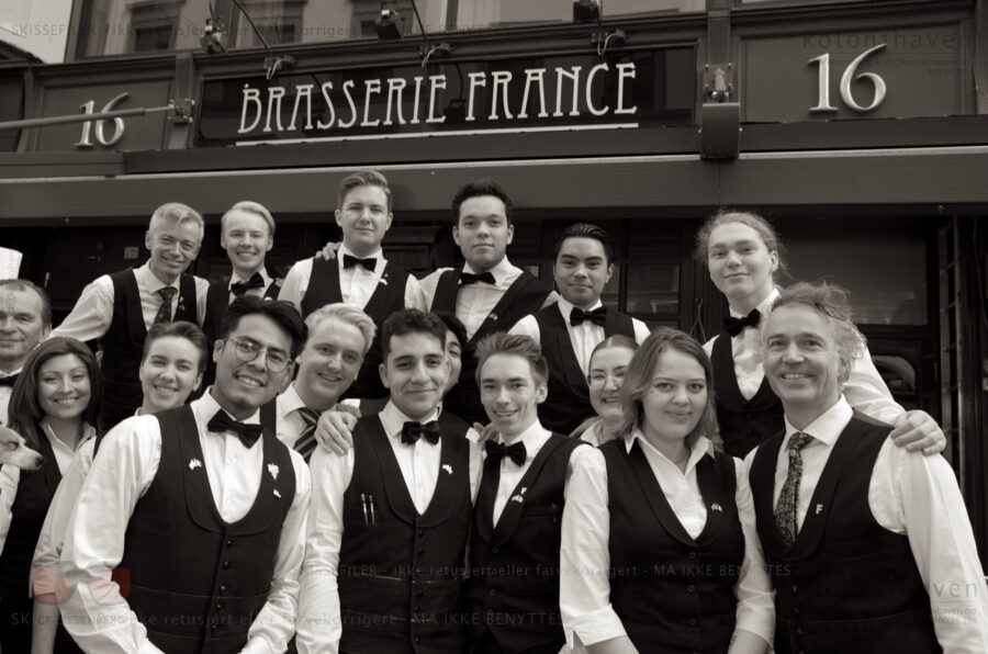 Alle våre servitører har enten fagbrev eller vinkelnerutdanning. Og vi har mange med lang erfaring. Opplæring i både kokk- og servitørfaget er viktig for oss, og vi har til enhver tid fra 4 til 6 servitørlærlinger vi forsøker å gjøre enda dyktigere enn oss! Vår service skal være 'old school' - alle har uniform, vi pusser skoene daglig, vi kan alle mat og vin, vi flamberer, blander tartar, anretter ost og dessert. Vi er eksperter på service!
